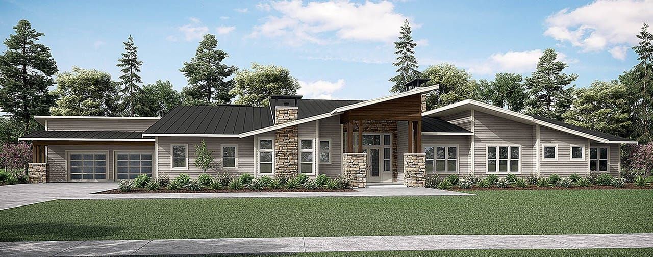 Introducing the Pomona, a stunning single-story house plan that artfully combines modern elegance with prairie-inspired accents