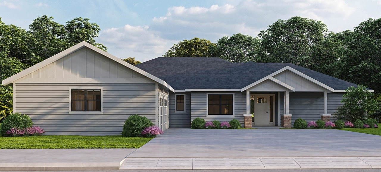 Nestled on a lush corner lot, this single-story ranch home plan embodies refined living with its view lot design