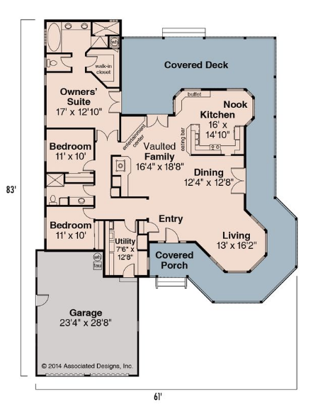 A vaulted ceiling defines the family room, where a skylight, French doors, an entertainment center, and an energy-efficient woodstove create a cozy, bright gathering space. The spacious kitchen offers two bay windows—one for an airy nook and another framing a gently curved J-shaped buffet. From the sink, you enjoy an open view into the great room over a long eating bar.