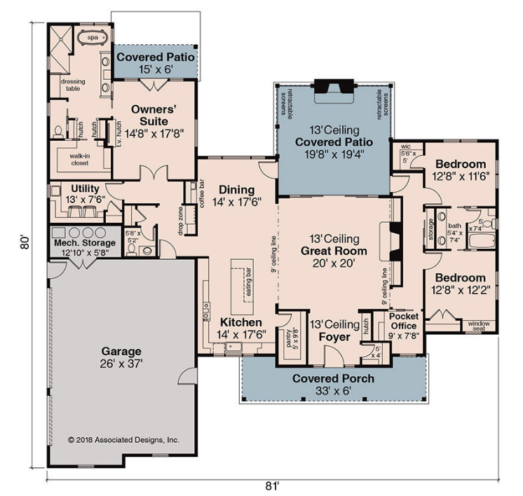 With 2,779 square feet of living space, this single-level design accommodates three bedrooms, two full bathrooms, and one-half bath, making it ideally suited for family living, entertaining, or quiet country retreats.