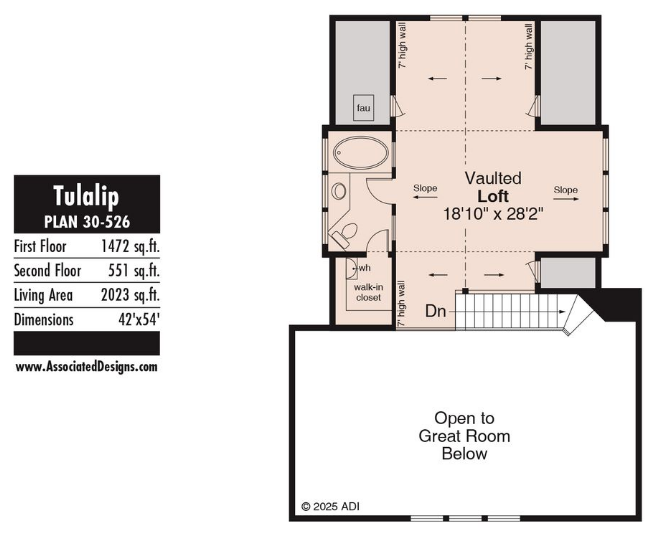 Upstairs, a large, vaulted loft provides versatile space for a third bedroom, office, or recreation room. This area includes a full bathroom and walk-in closet, along with views down to the great room below, enhancing the home’s open feel.