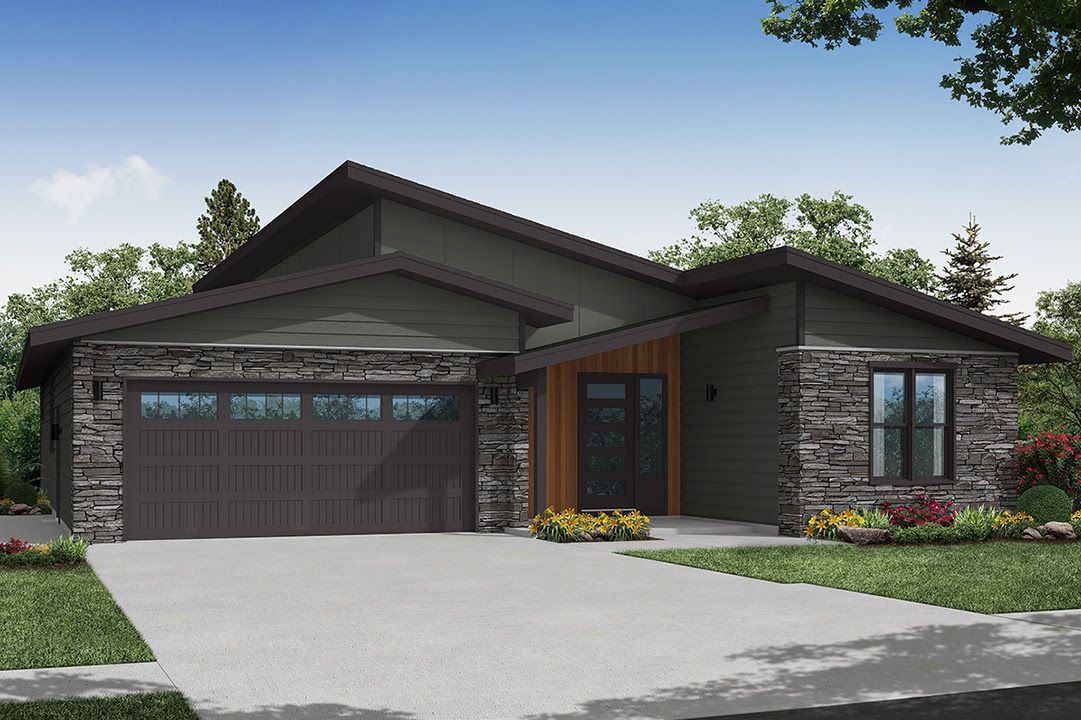 Experience the epitome of modern living with the Wind Ridge house plan, where a seamless blend of natural materials and striking shed roofs create an exterior that's both aesthetically pleasing and functional.