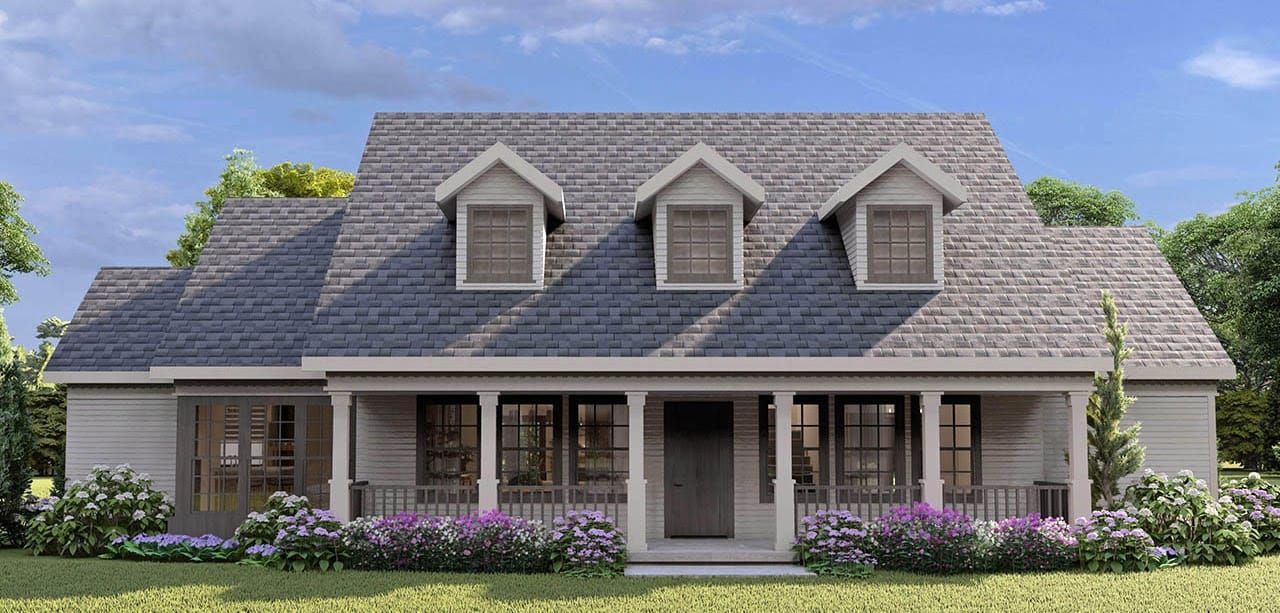 the Wyndmere home design boasts a welcoming appearance with its wide front porch and numerous street-facing windows.