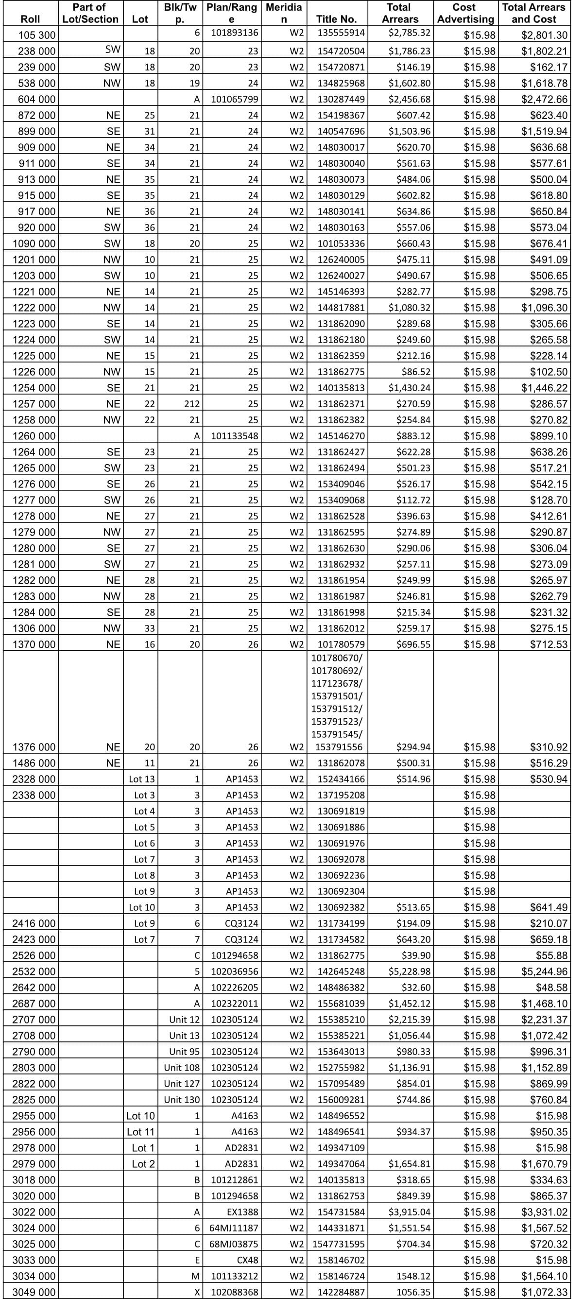 Notice is hereby given under the Tax Enforcement Act that unless the arrears and costs appearing opposite the land and title number described in the following list are fully paid before the 10th day of May 2026, an interst based on a tax lien will be registered against the property.
