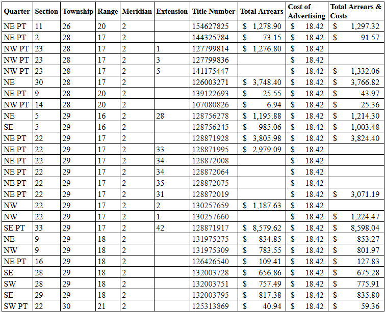 Notice is hereby given under The Tax Enforcement Act that unless the arrears and costs appearing opposite the land and title number described in the following list are fully paid before the 31st day of December, 2025, an interest based on a tax lien will be registered against the land. Note: A sum for costs in an amount required by subsection 4(3) of The Tax Enforcement Act is included in the amount shown against each parcel.
