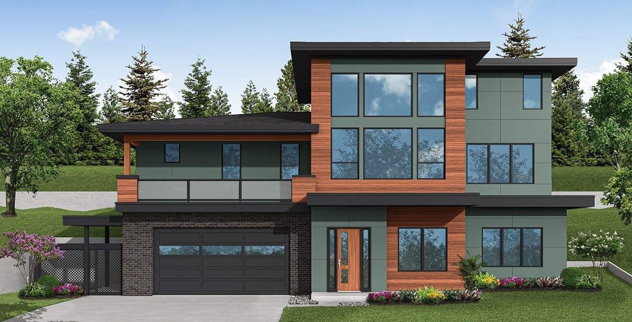 The exterior of the Bethel exudes sophistication, with a thoughtful combination of brick, horizontal wood siding, and expansive glass windows that bathe the home in natural light. Clean, geometric lines and flat rooflines underscore the contemporary aesthetic, while the landscaped yard and wide driveway leading to an oversized garage enhance its curb appeal.