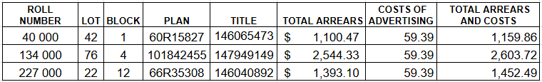 Note: A sum for costs in an amount as required by Subsection 4(3) of The Tax Enforcement Act is included in the amount shown against each parcel.