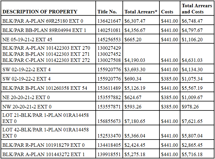Note: A sum for costs in an amount required by subsection 4(3) of The Tax Enforcement Act is included in the amount shown against each parcel.