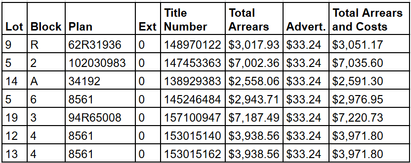 Note: A sum for costs in an amount required by subsection 4(3) of The Tax Enforcement Act is included in the amount shown against each parcel