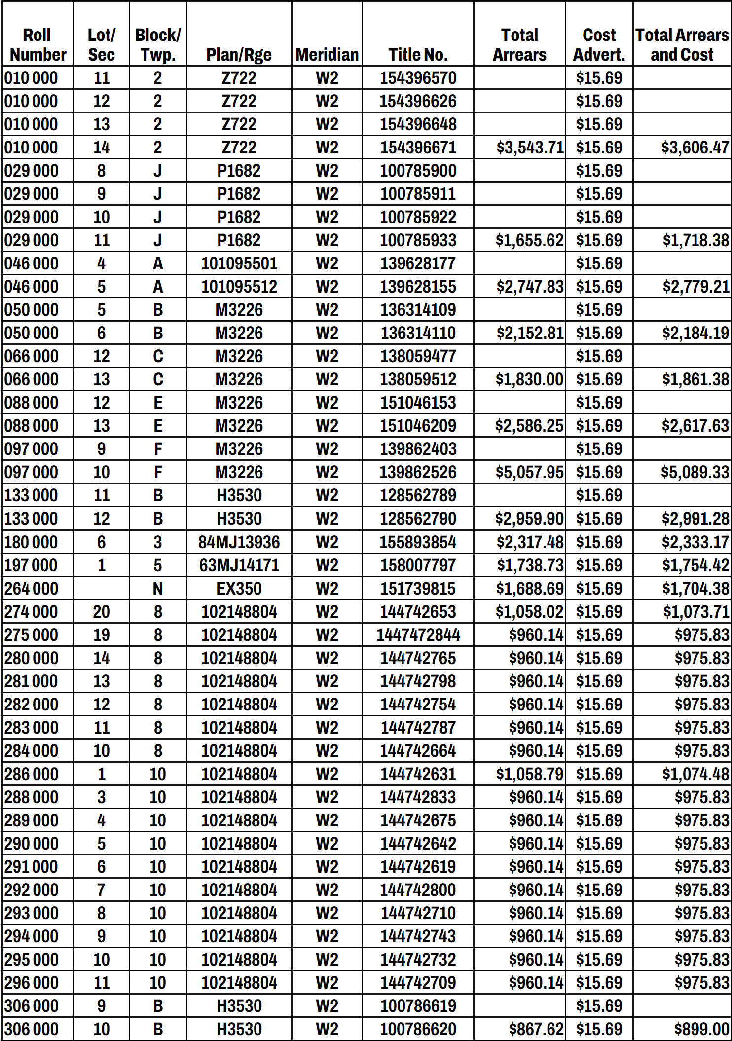 Note: A sum of cost in an amount required by subsection 4(3) of The Tax Enforcement Act is included in the amount shown against each parcel