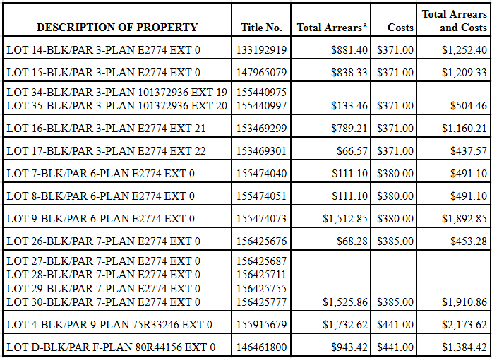 Note: A sum for costs in an amount required by subsection 4(3) of The Tax Enforcement Act is included in the amount shown against each parcel.