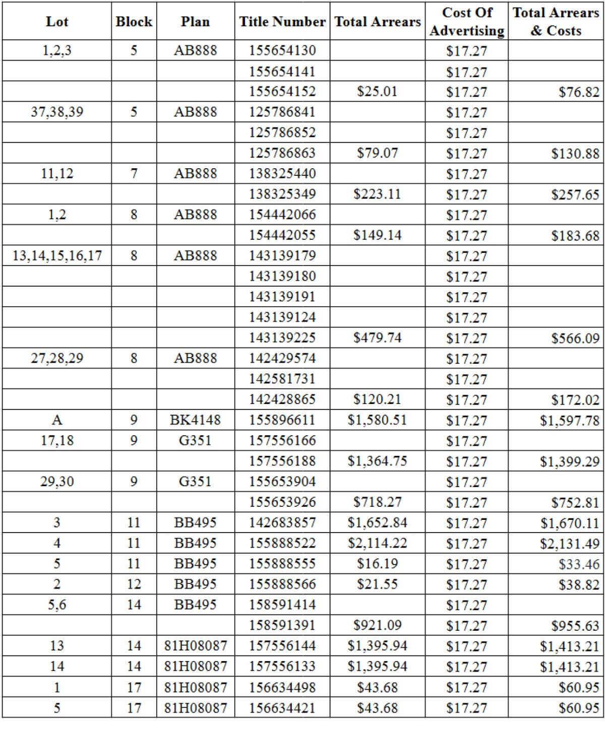 Note: A sum for costs in an amount required by subsection 4(3) of The Tax Enforcement Act is included in the amount shown against each parcel.